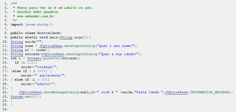 JOptionPane.showMessageDialog(null,n1+" você é " +saida,"Testa Idade ",JOptionPane.INFORMATION_MESSAGE);