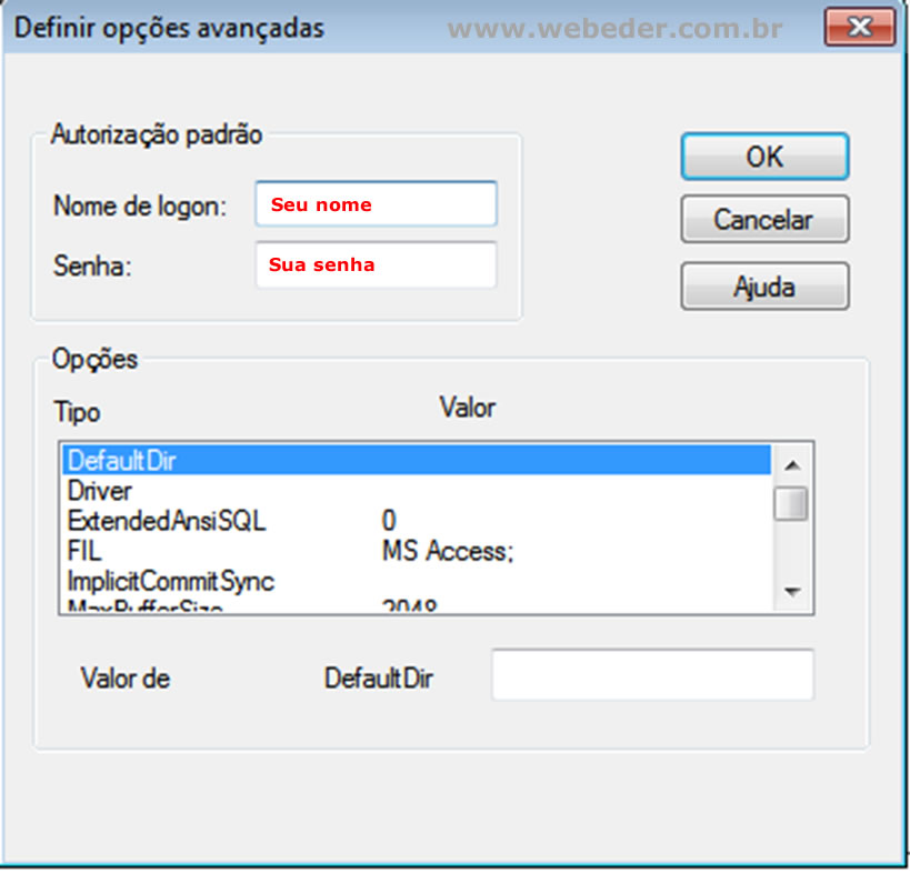 Obs.. Caso você tiver um banco sem usuário e senha é possível que de erro então crie uma senha dentro do Access para isso.