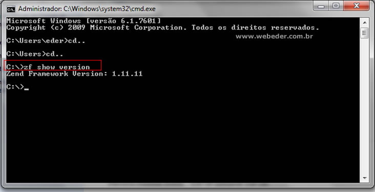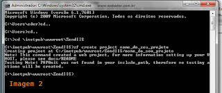 5º vamos digitar cd.. até chegar em “C:\” novamente e vamos colocar o caminho do site “C:\inetpub\wwwroot\ZendIIS” que será o pasta do meus arquivos criados pelo Zend Tool. Daremos o comando zf create project [nome_do_projeto] . Igual às imagens 1 e 2.