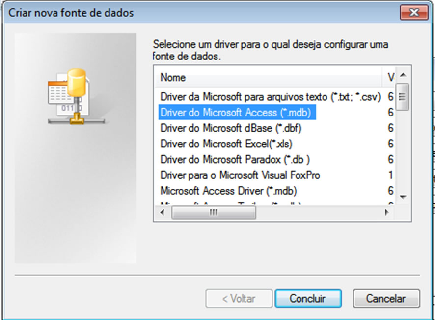 Agora selecione o driver neste caso estamos usando o exemplo do Access, mas poderia ser ORACLE ou SQL Server.